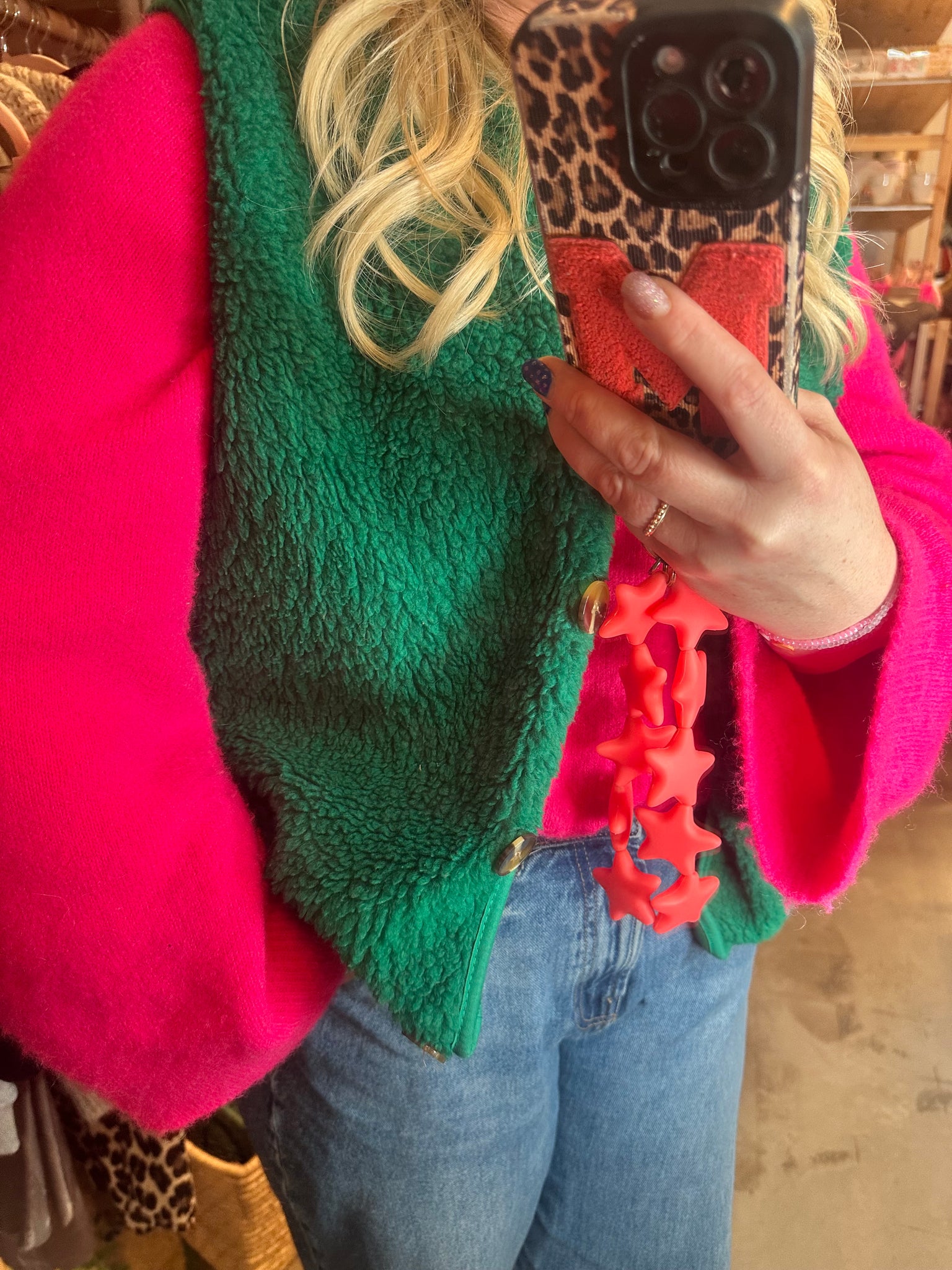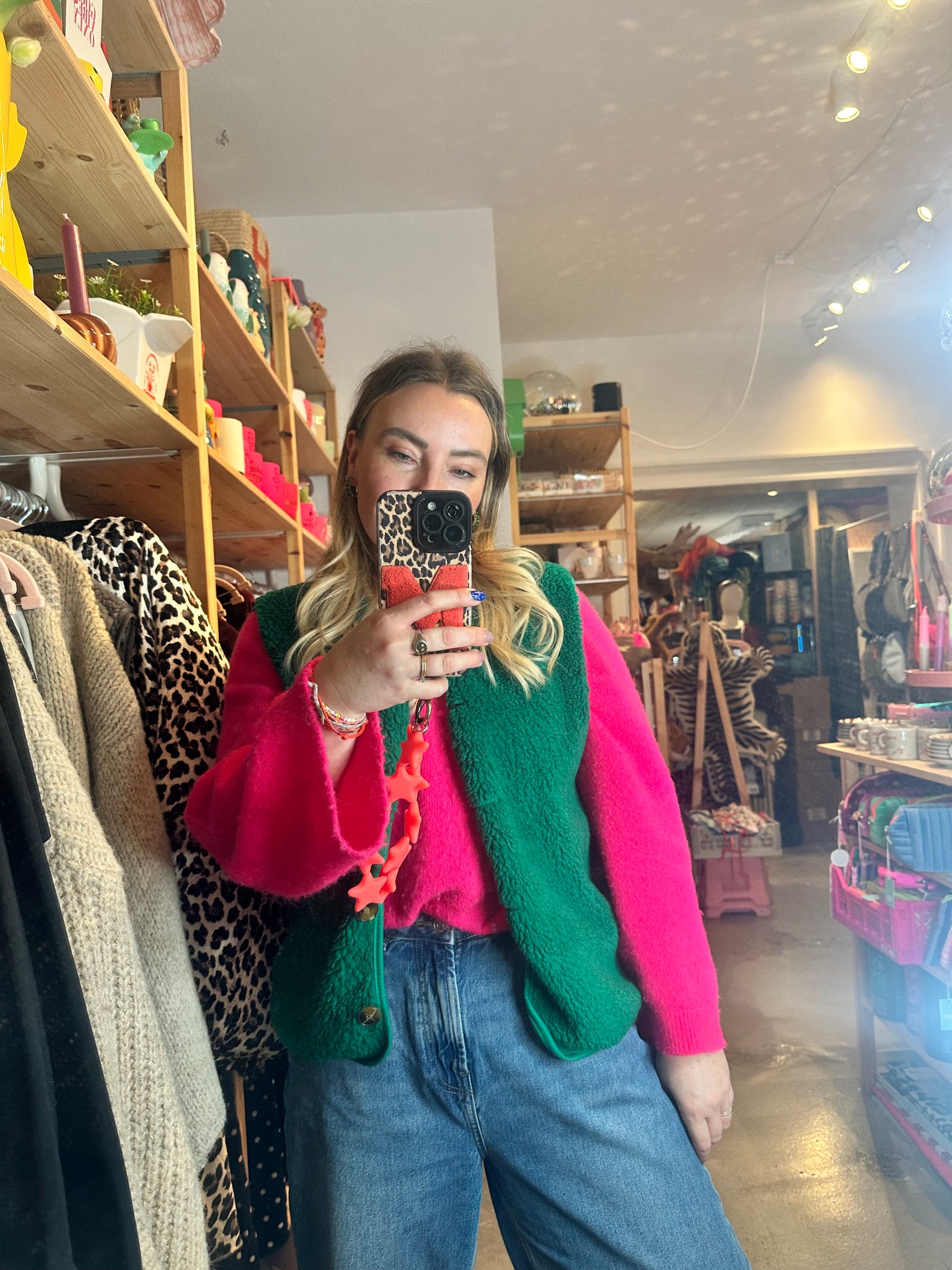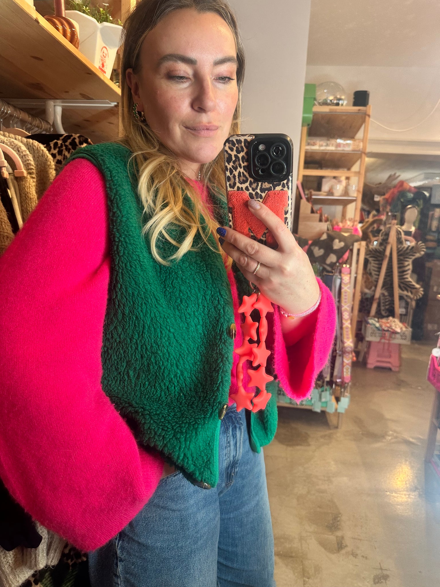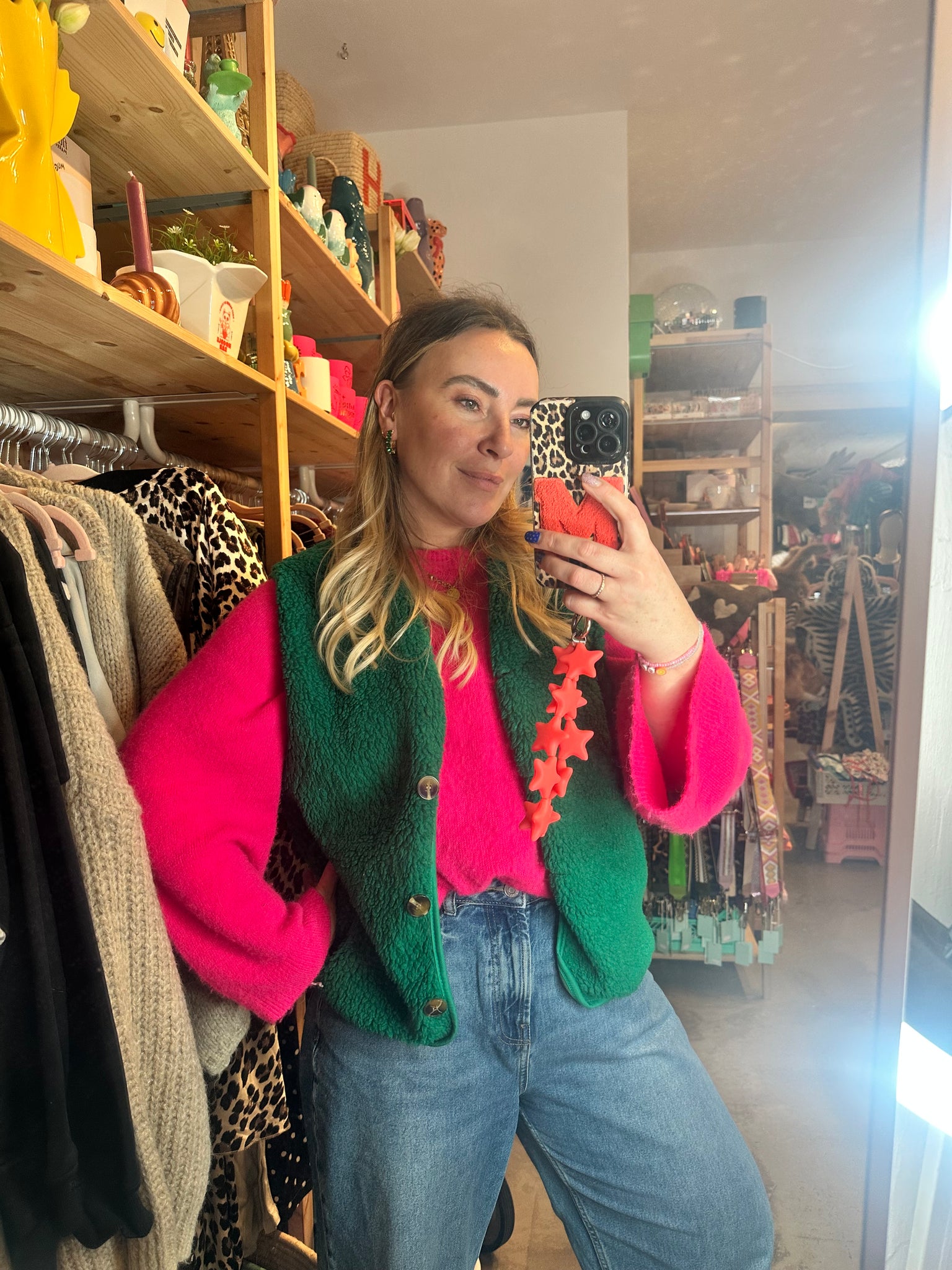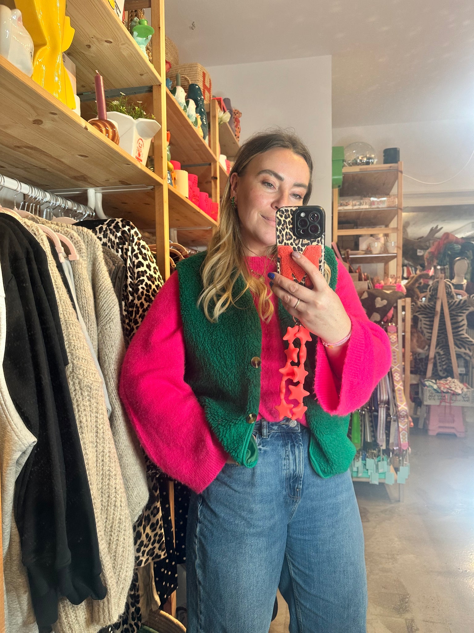 Diese stylische Teddyweste in kräftigem Grün ist das Must-have für die Übergangszeit und kühle Tage! Ihr superweiches Material sorgt für ein gemütliches Tragegefühl, während der moderne Schnitt jedem Outfit das gewisse Etwas verleiht. Ob über einem Pullover, Kleid oder Shirt – diese Weste lässt sich vielseitig kombinieren und ist ein echtes Statement-Piece.